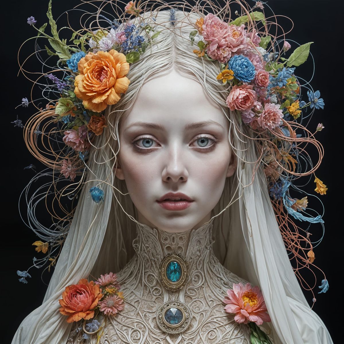 This image depicts a ghost spirit in a futuristic, electropunk setting, surrounded by glowing electrical cords and vibrant, surrealist flora. A dreamlike quality and ornate textures evoke a sense of whimsical curiosity, inviting exploration of a dimensional universe.