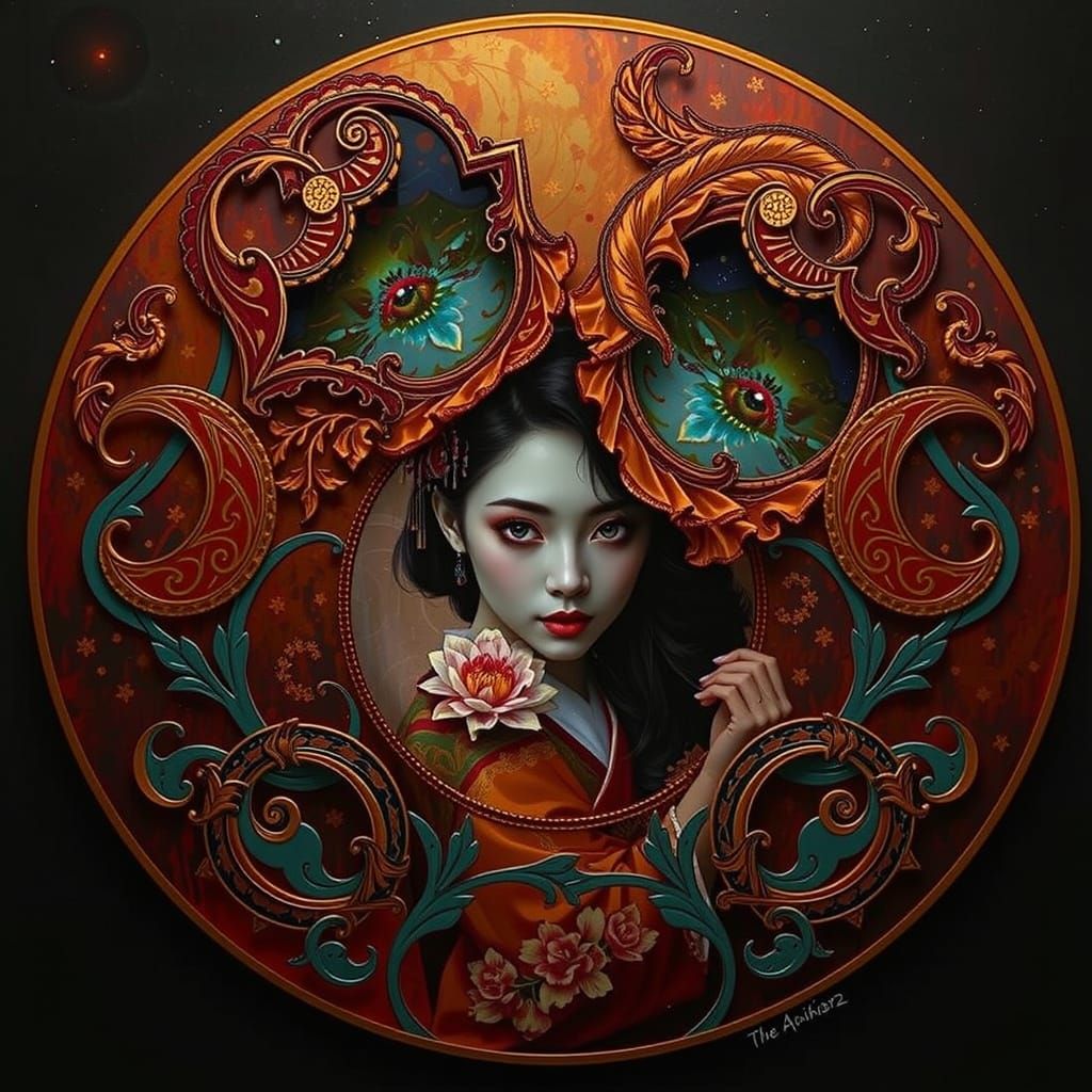 This hyperrealistic image features a geisha with dark hair and green eyes, adorned in a vibrant, multi-colored dress with golden motifs. She touches her reflection amidst a cosmic pond filled with irises and chrysanthemums.