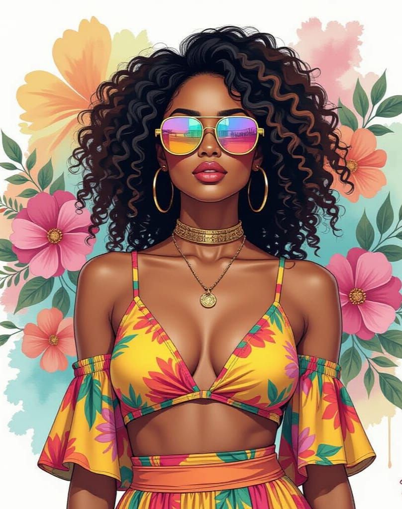 A vibrant image of a Sudanese woman in cyberpunk style. She is depicted in a stylish bohemian outfit and digital sunglasses against a floral backdrop, rendered in an Afrofuturist aesthetic.
