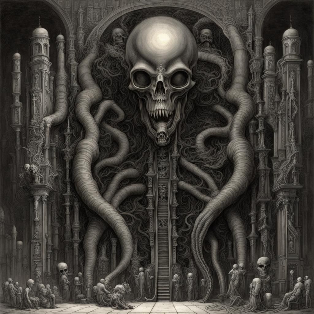 This image shows a grotesque biomechanical machine consuming itself, with black fluid flowing from its inner workings. The artwork has a horror aesthetic.