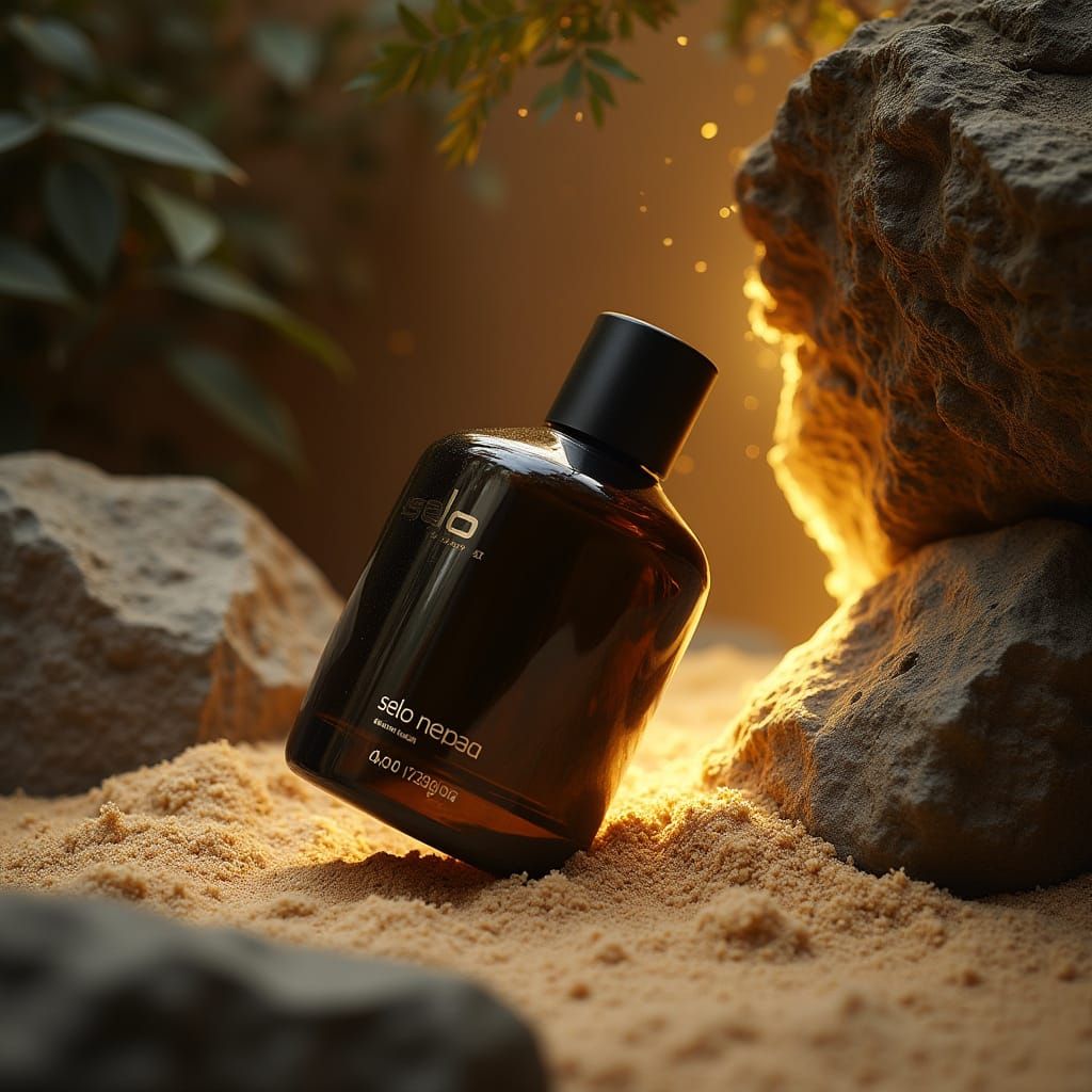 This still life scene showcases a luxury beauty care product in dark glass, set against a rugged, earthy backdrop of worn boulders and moss-covered terrain, bathed in warm, golden light and featuring intricate moldings and precise craftsmanship.