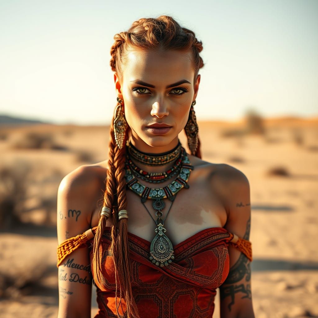 This image captures a stunning woman with red braided hair, intricate jewelry, and tribal patterns, set against a desert landscape with natural light and soft focus. The subject's fair skin and serious expression are juxtaposed with detailed tattoos and a bold, bohemian style.