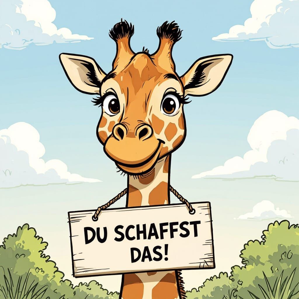 This image shows a friendly giraffe with a sign around its neck that says "You can do it". The artwork is in a colorful and humorous comic style with clear lines and pastel tones.