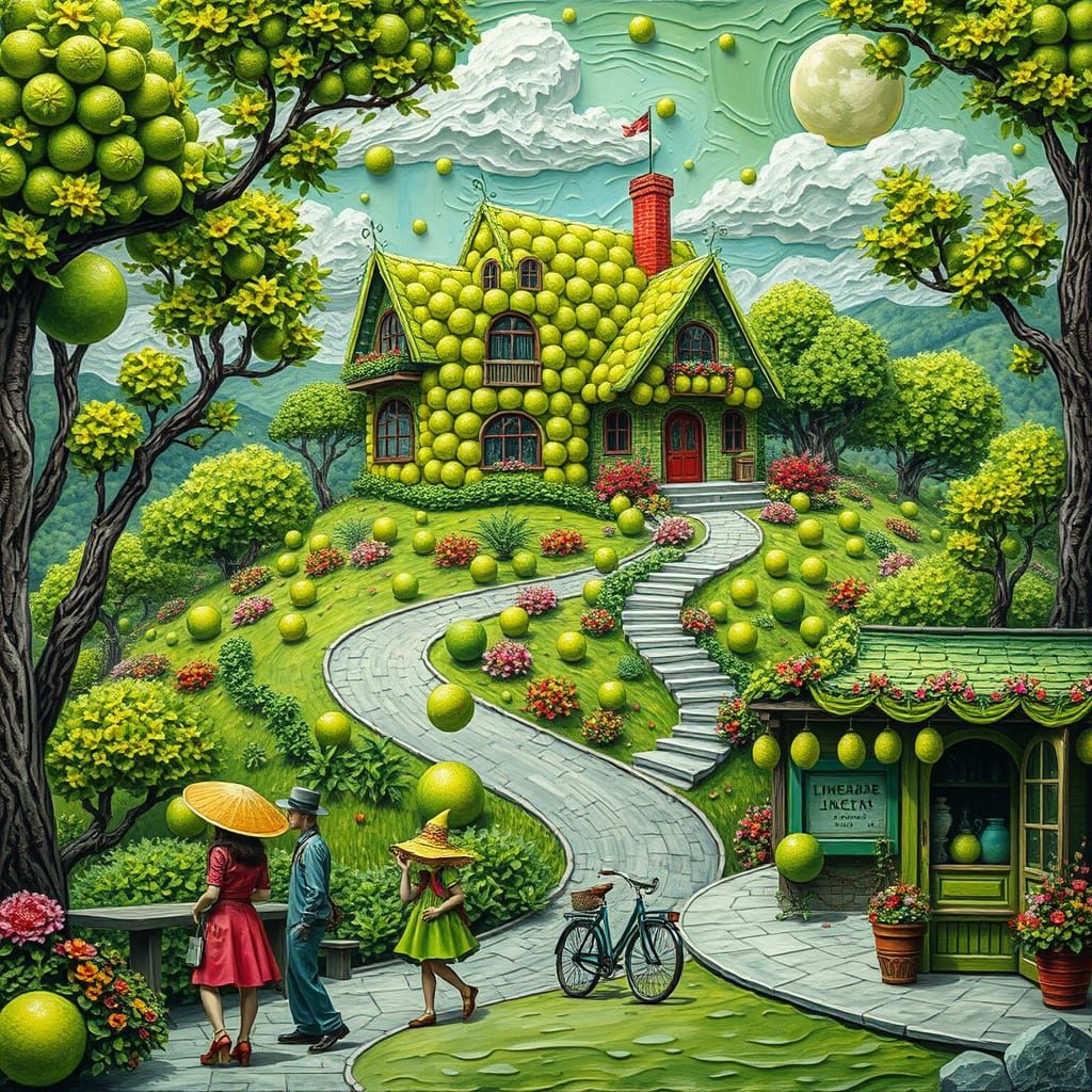 This whimsical scene features a lime-colored house on a hill, surrounded by lush greenery and vibrant flowers, with intricate details and a textured, impasto aesthetic reminiscent of Tim Burton's style, evoking a sense of wonder and enchantment.