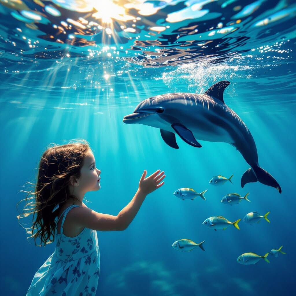This image shows a girl in a vibrant blue sea reaching out to a dolphin, with sunlight filtering through the water and fish swimming by. Rendered in a realistic digital painting style, it emphasizes human-marine harmony.