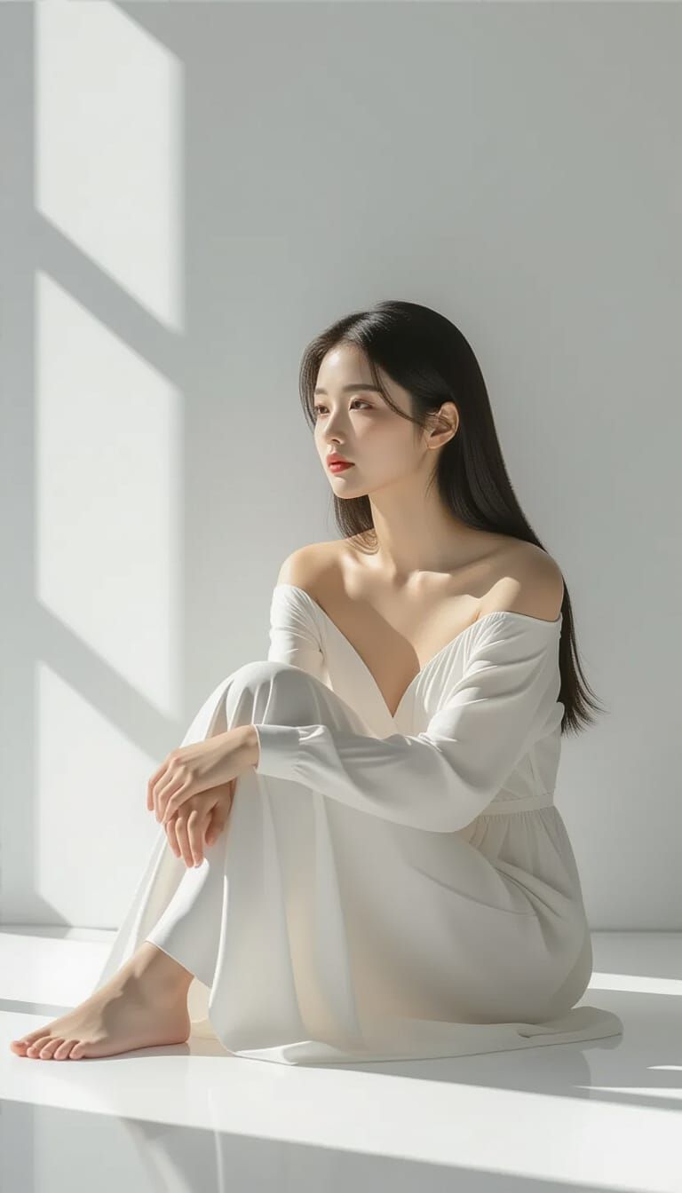 A photorealistic image of a young Korean woman in a white dress, sitting thoughtfully in a minimalist studio. Soft light creates a calm, elegant atmosphere with a shallow depth of field.