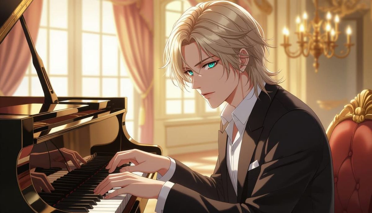 This photorealistic image shows a slender man with blond hair and teal eyes playing a grand piano, a rose held gently in his lips. Cinematic lighting creates an intimate mood.