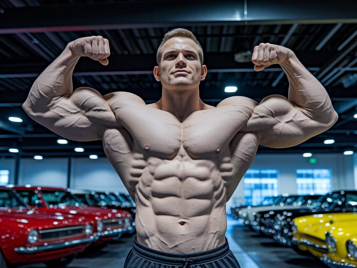 This image shows a dynamic, anthropomorphic car flexing its muscles, capturing the essence of raw power and energy.