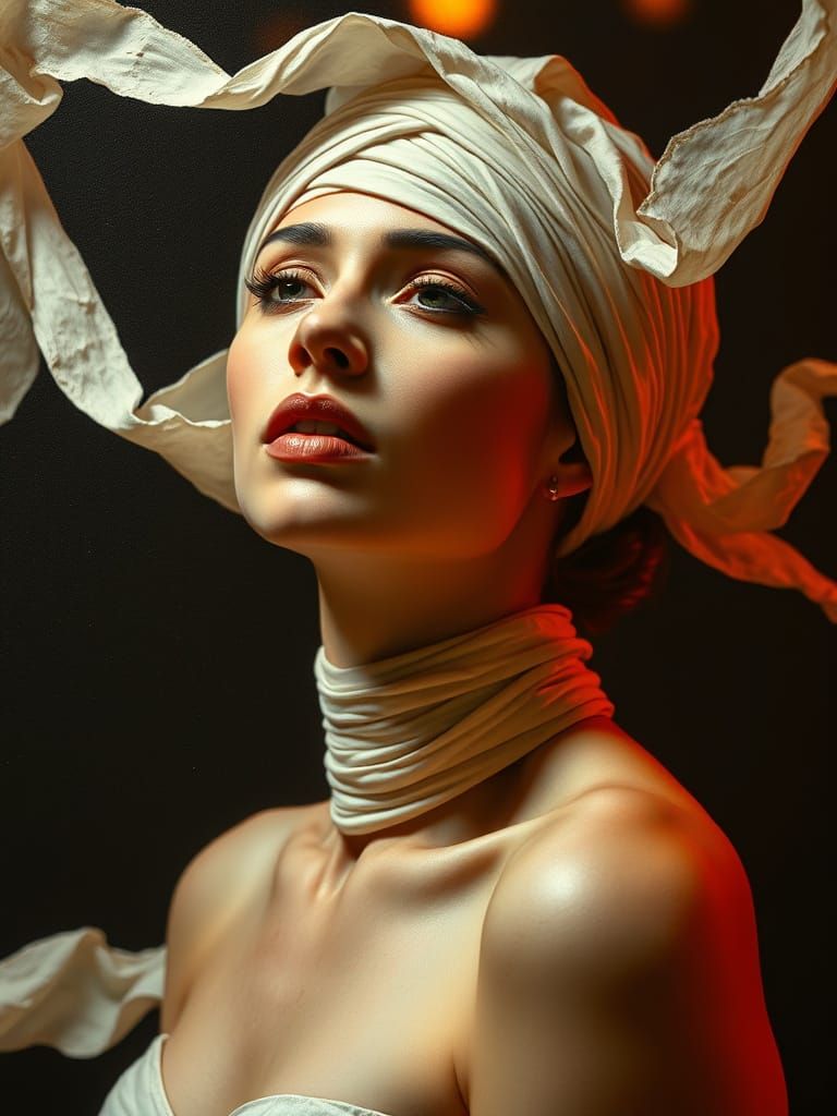This image shows a woman wrapped in mummy bandages in a dramatic pose under stage lights. The scene features an ultra-realistic performance art aesthetic with rich, earthy tones.