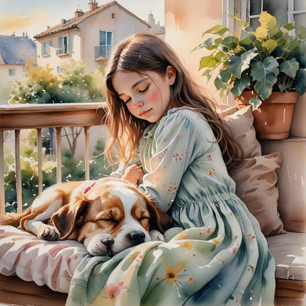 This image shows a watercolor portrait of a young girl and her puppy sleeping on a balcony. The artwork features soft focus, whimsical brushstrokes, and a gentle pastel color palette, creating a dreamy and serene aesthetic.