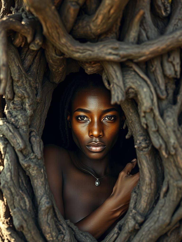 A mysterious African woman is trapped in a gnarled tree, her intelligent eyes and warm skin contrasting with the eerie, haunting atmosphere and intricate patterns of the twisted branches, in a photorealistic scene of deep shadows and foreboding, reminiscent of atmospheric photography and hyper-realistic ...