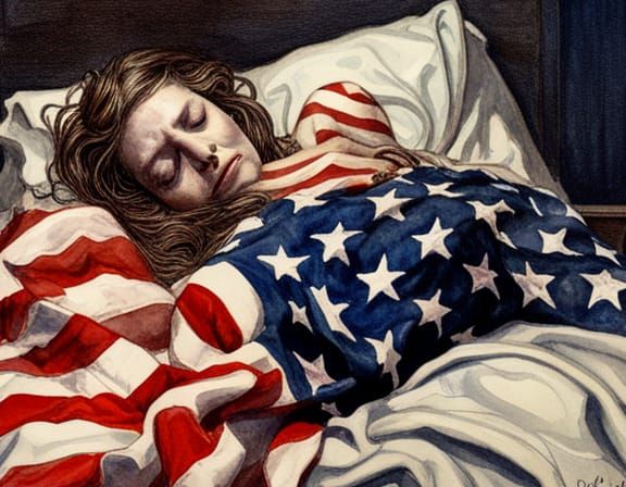 A surreal watercolor painting of a female devil sleeping, draped in an American flag. The artwork blends occult and Americana themes in a faded, hyperdetailed aesthetic.