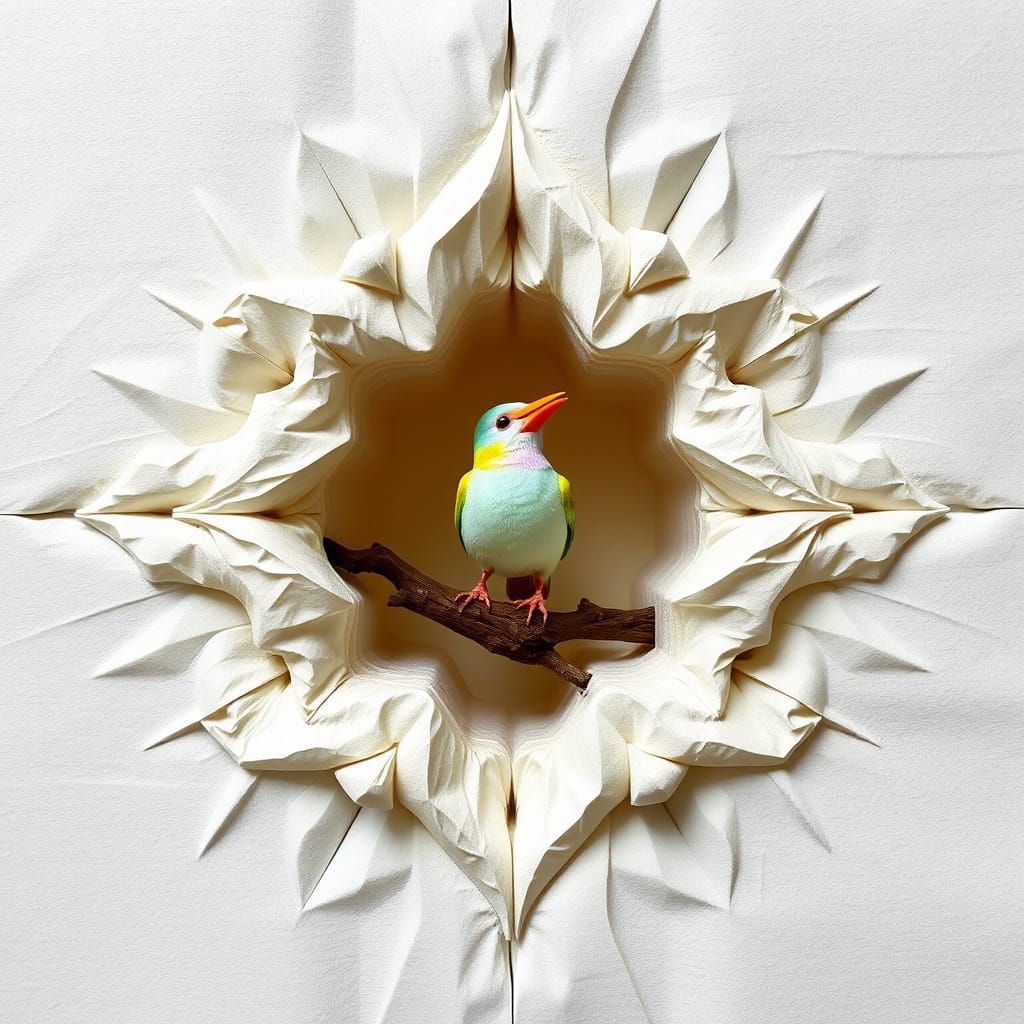 A surreal image featuring a neon green rabbit as a guardian, surrounded by abstract elements representing folded concepts and layers of meaning. The scene evokes a sense of mystery and profound significance.