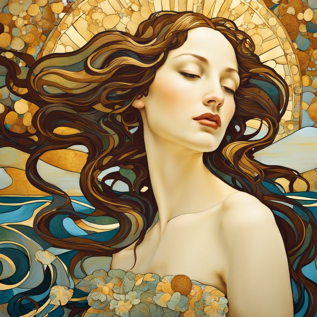 A shimmering, golden image evoking the Birth of Venus. The artwork is rendered with swirling patterns and opulent details, reminiscent of art nouveau.