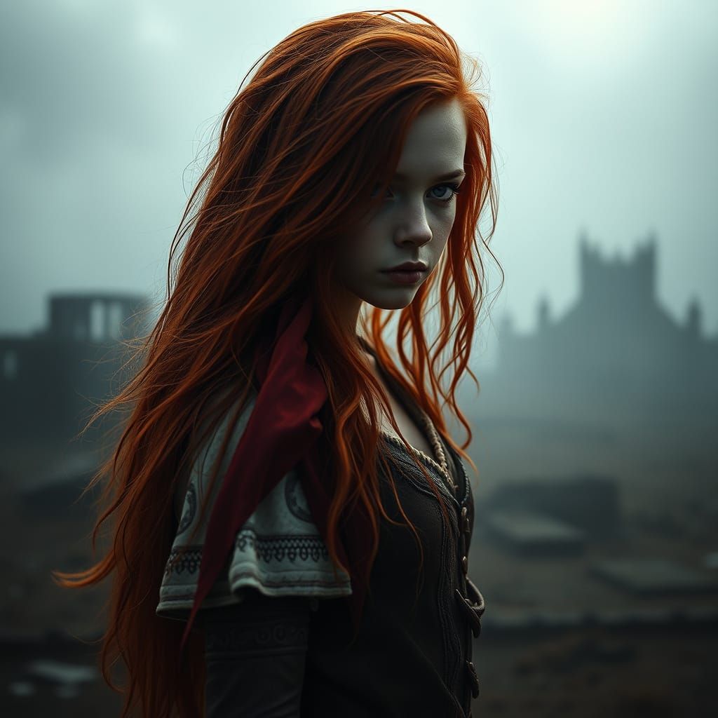 This image shows a small girl in a blended It/Harley Quinn costume. The image features long red hair, a smoky background, and soft lighting. The style evokes dark fantasy with cinematic quality.