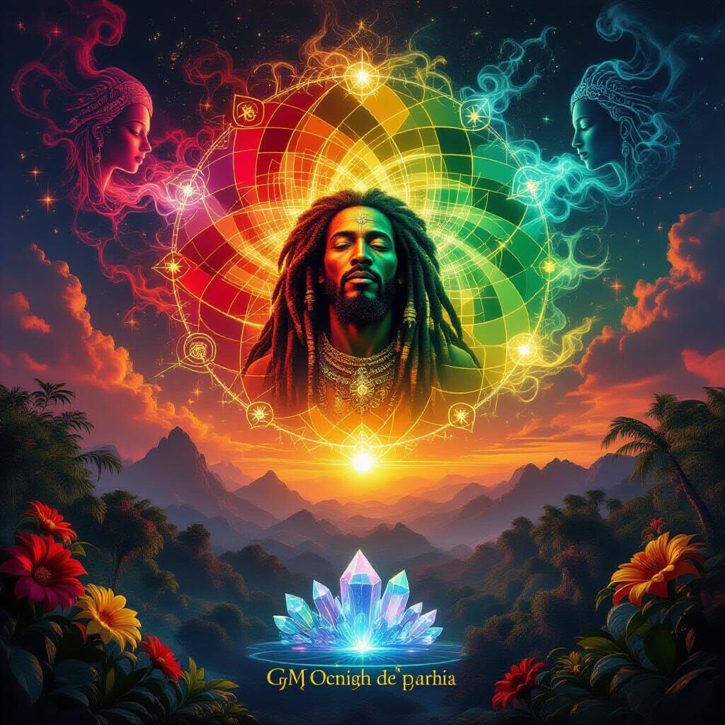 This image depicts a vibrant, bioancestral psychedelic sunrise. A Rastafarian spirit emanates energy through cosmic waves, blending nature and technology in a dreamlike, Afro-futurist scene.