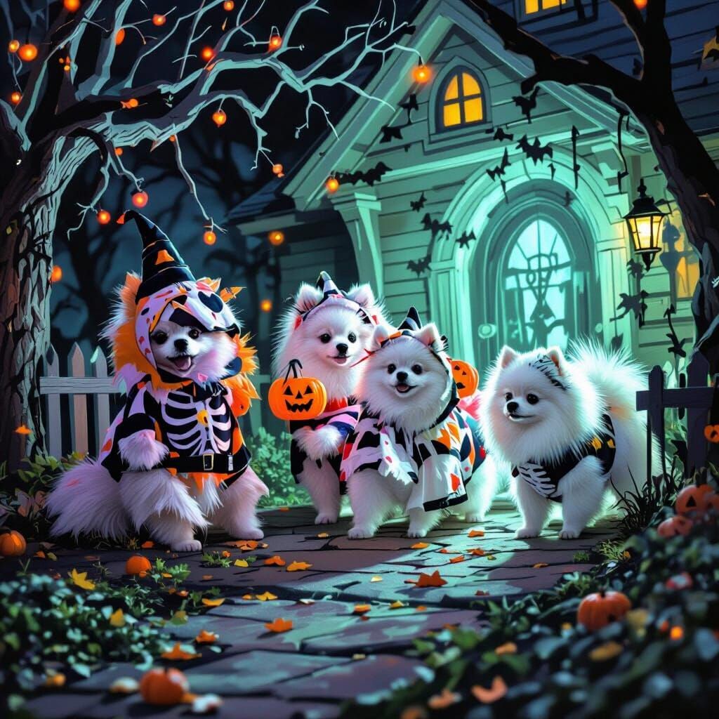 This image captures adorable white Pomeranians in festive Halloween costumes as they go trick-or-treating at a spooky haunted house, ready for candy.