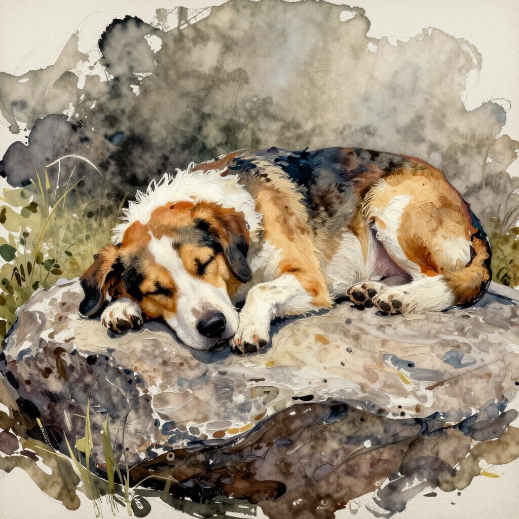 This image shows a tired dog resting on a rock, rendered in a thick, textured gouache and watercolor style with impressionist influences. 8k resolution.