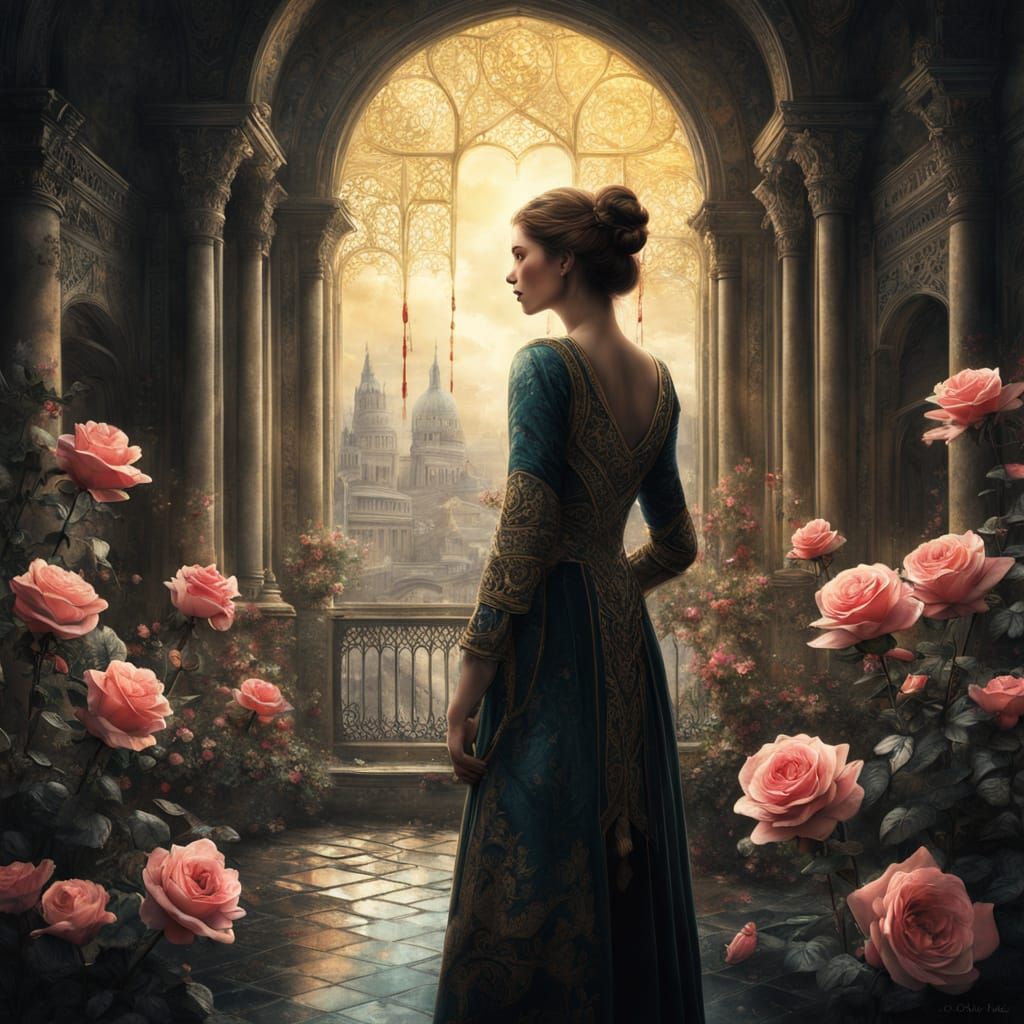 A beautiful image showing yellow and pink roses with hand-written poetry on old parchment. The artwork uses double exposure and warm colors to create a magical and emotional scene in watercolor and ink.