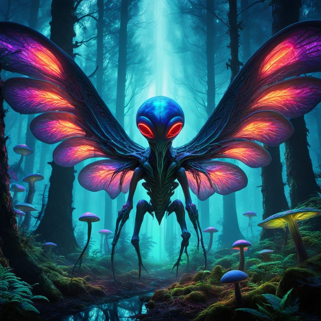 A striking picture of an alien in a dark forest. Glowing mushrooms and iridescent wings are visible in the misty, neon-lit scene. Rendered as psychedelic, abstract digital art.
