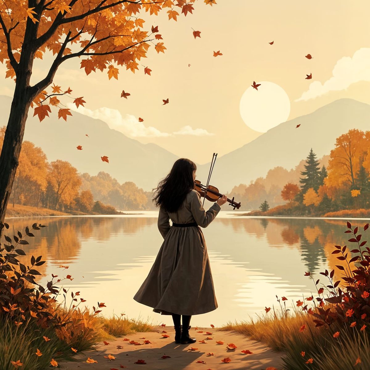 This image captures a poignant moment of a violinist expressing deep emotion, set against a backdrop of a fading, autumnal landscape, evoking themes of nostalgia and longing.