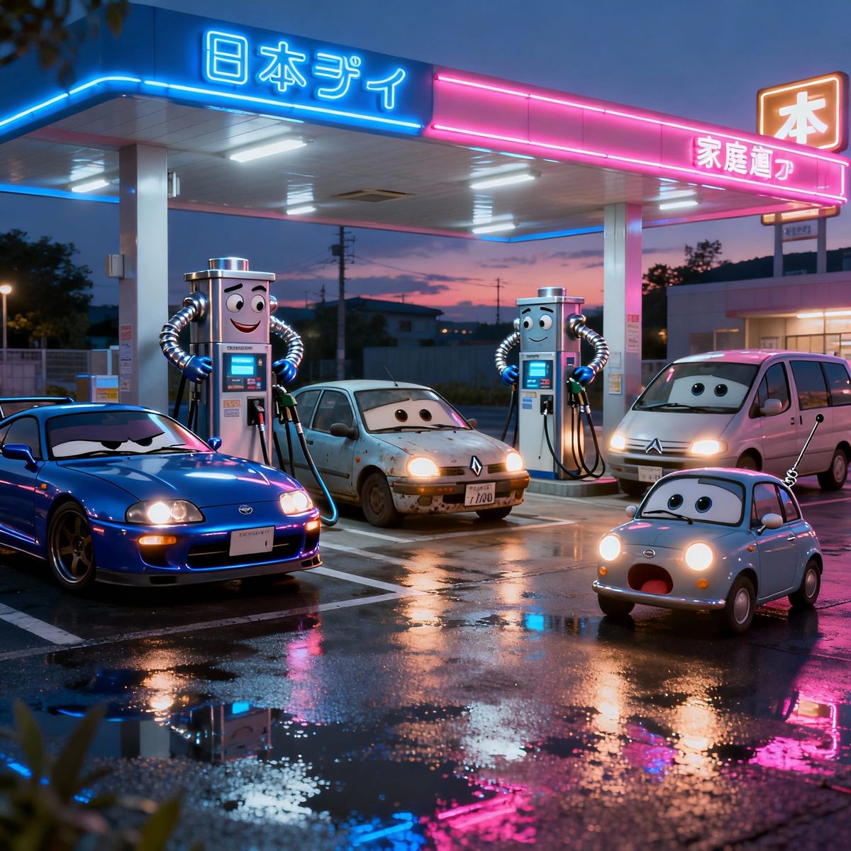 This image depicts a cinematic view of a Japanese gas station at dusk, featuring glowing neon signs, wet asphalt reflections, and anthropomorphic gas pumps interacting with expressive cars.