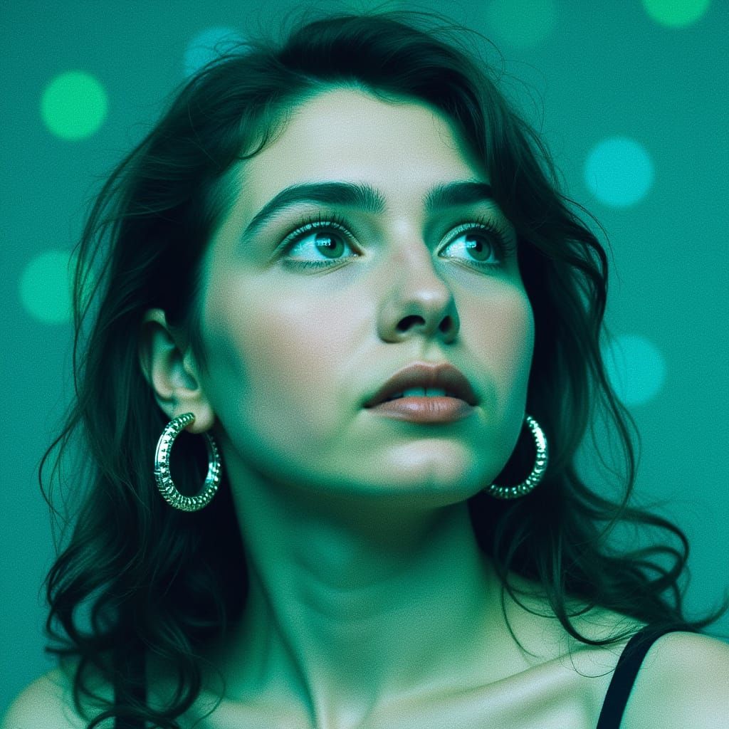 A close-up portrait of a young brunette woman with hoop earrings looking up. The image has a blue-green tint and grainy texture, reminiscent of a paused VHS frame, with a sharp focus and bokeh effect.