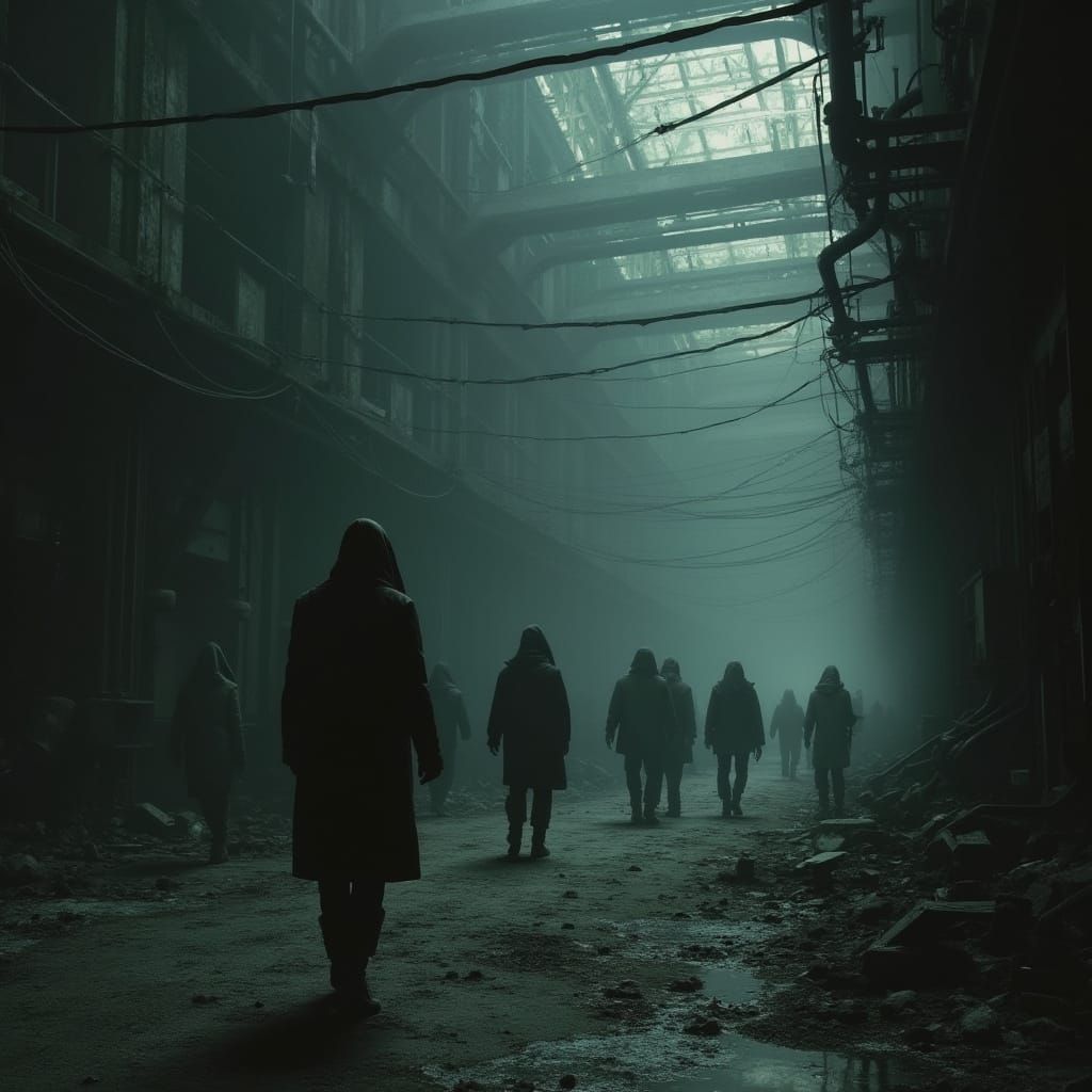 This image shows a group of figures in a dark industrial setting with old machinery, creating an eerie atmosphere. The scene is rendered with dark, muted colors and textures, in a surrealist style.