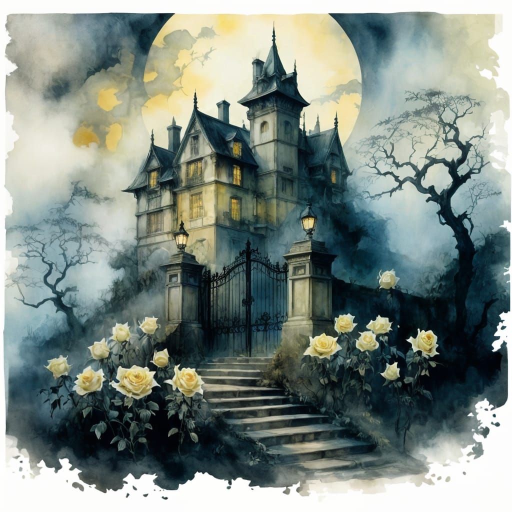 This image is a stunning watercolor concept art piece depicting a misty, slightly run-down manor house on a hill, bathed in ethereal moonlight and surrounded by a mystical atmosphere.