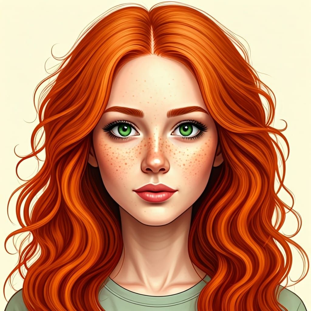 A striking picture of a young, red-haired woman with bright green eyes and freckles. Her wavy hair shines in this portrait, capturing her youthful beauty.
