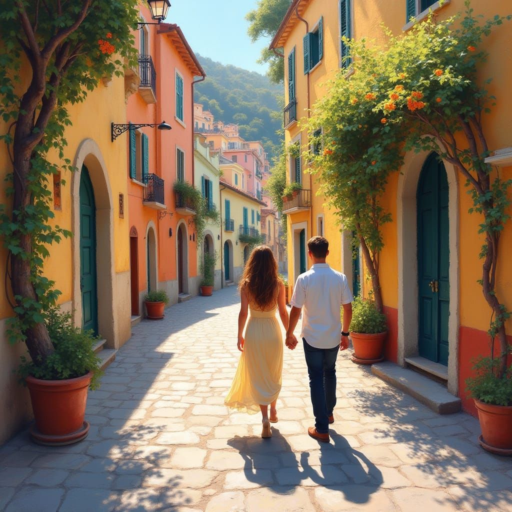 This image shows a couple walking hand-in-hand on a cobblestone street in Amalfi, Italy. The golden light illuminates the colorful Mediterranean buildings in an impressionistic style.