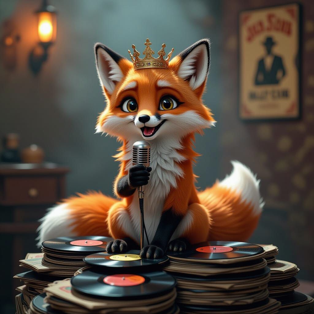 This image shows a fox in a gothic crown singing into a vintage microphone atop vinyl records. Bohemian folk art style with earthy tones and vintage grain.