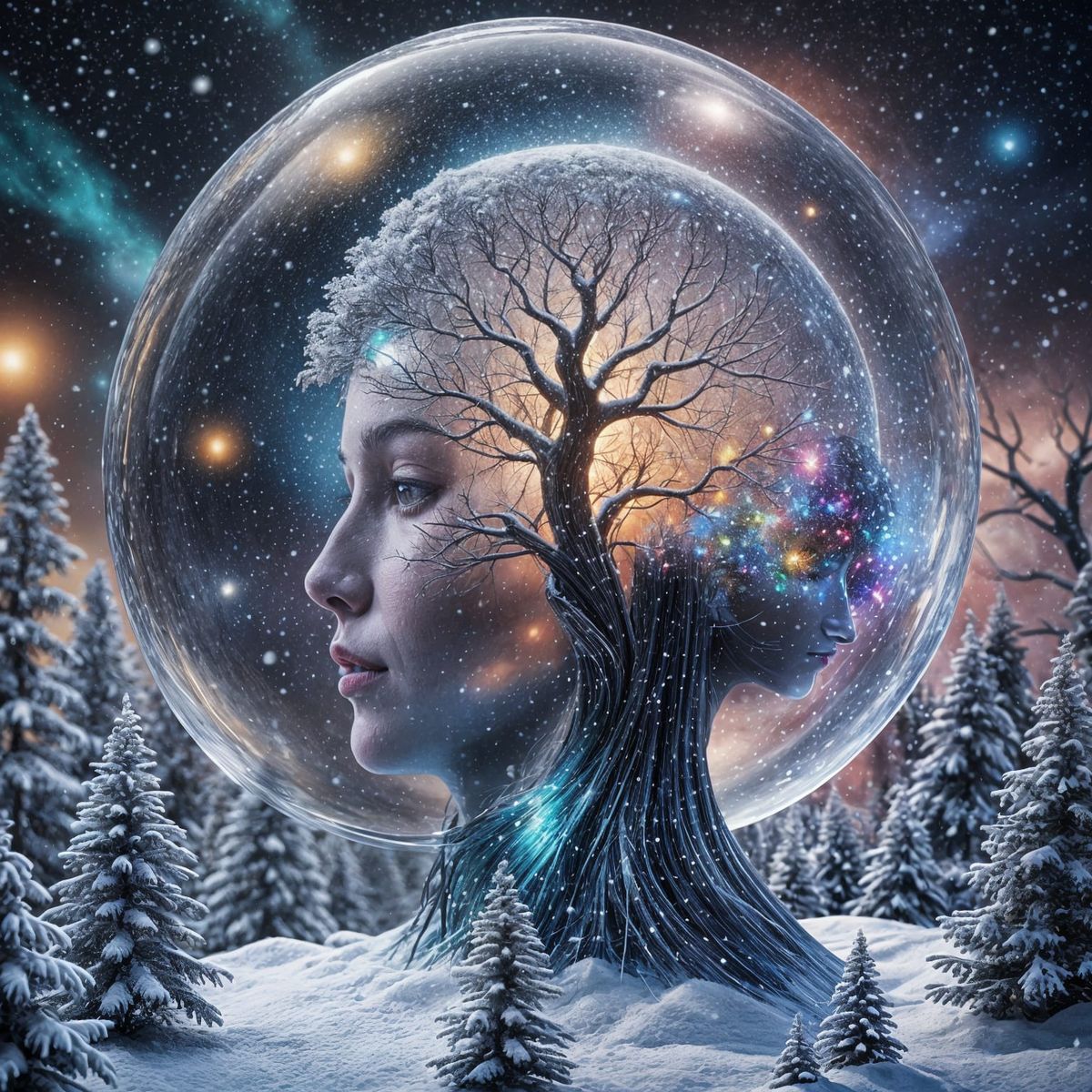 This image shows a surreal snow globe replacing a person's brain. The holographic illustration evokes astral and cosmic themes, rendered in a mixed media style.
