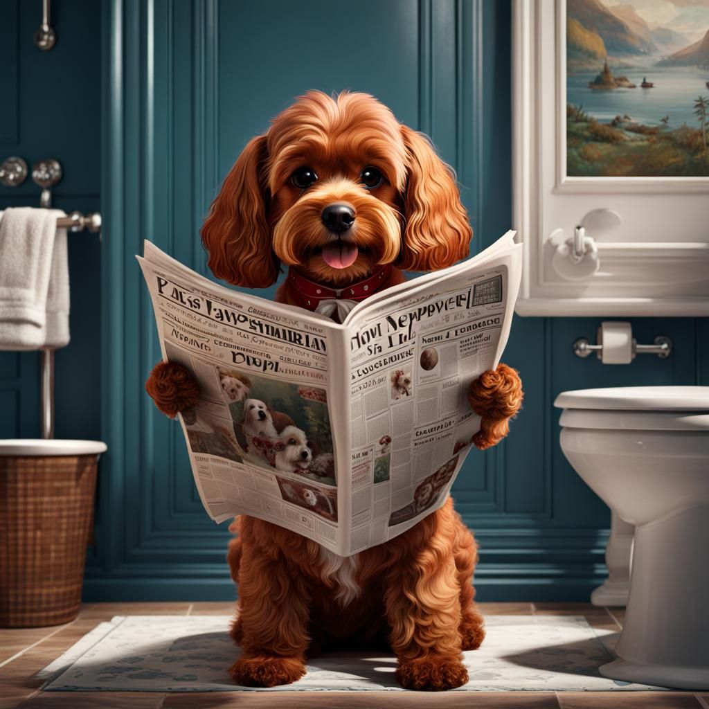 This image shows a red Cavapoo dog wearing pajamas and reading a newspaper while sitting on a toilet in a bathroom. The image is a detailed matte painting with complementary colors.