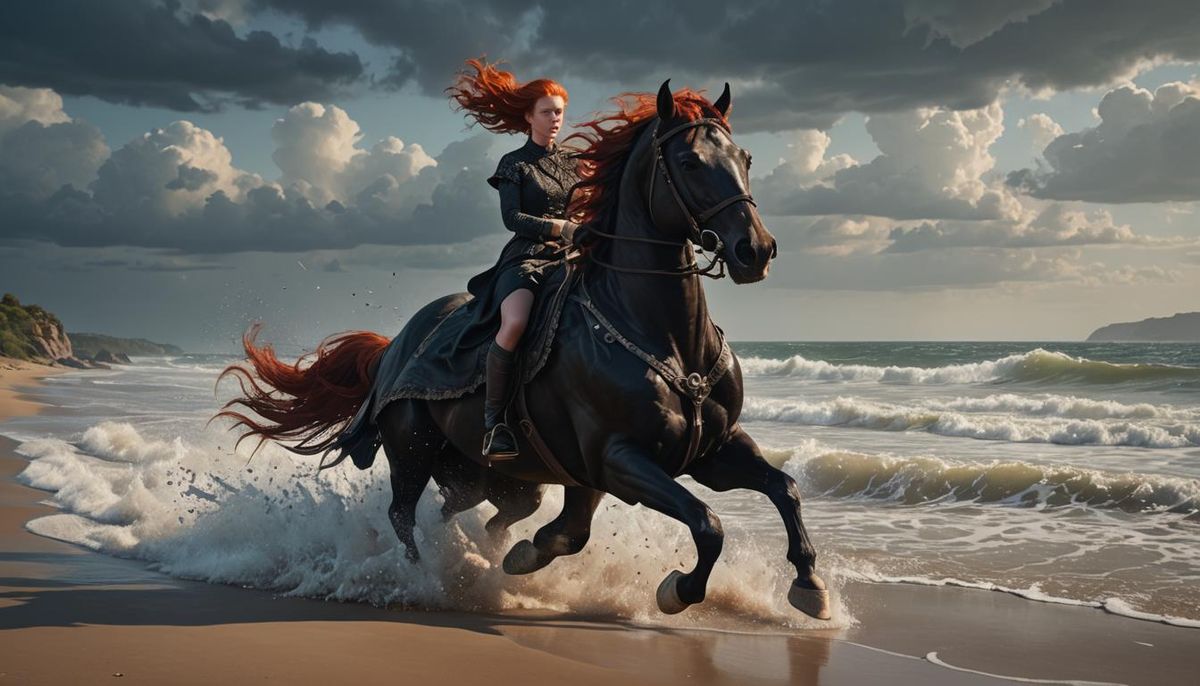 A striking picture of a red-haired woman riding a black horse along a beach. This dark fantasy art features dynamic lighting and intricate details, rendered with deep, complementary colors.