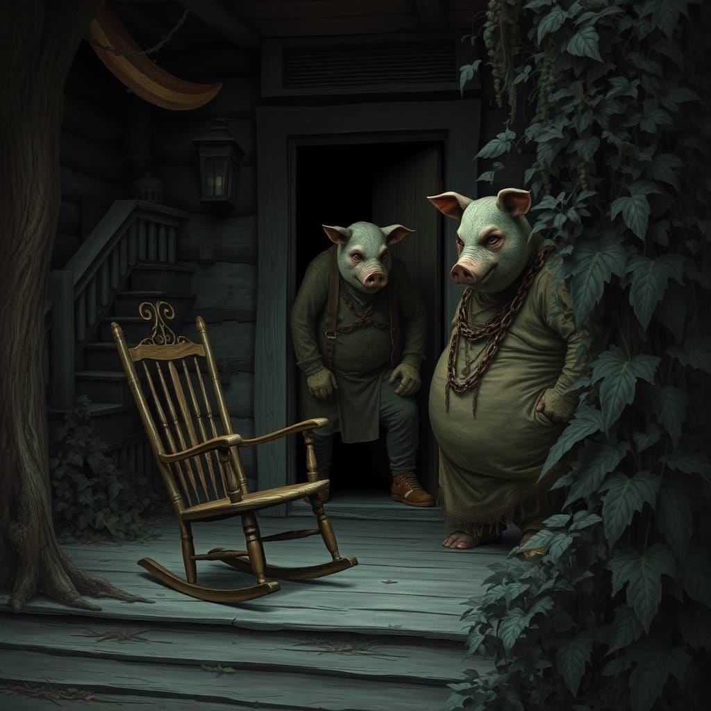 This image shows a dilapidated cabin porch with a rocking chair. A menacing figure in a pig mask lurks in the shadows. The scene is rendered in a dark, gothic style with muted colors and heavy textures.