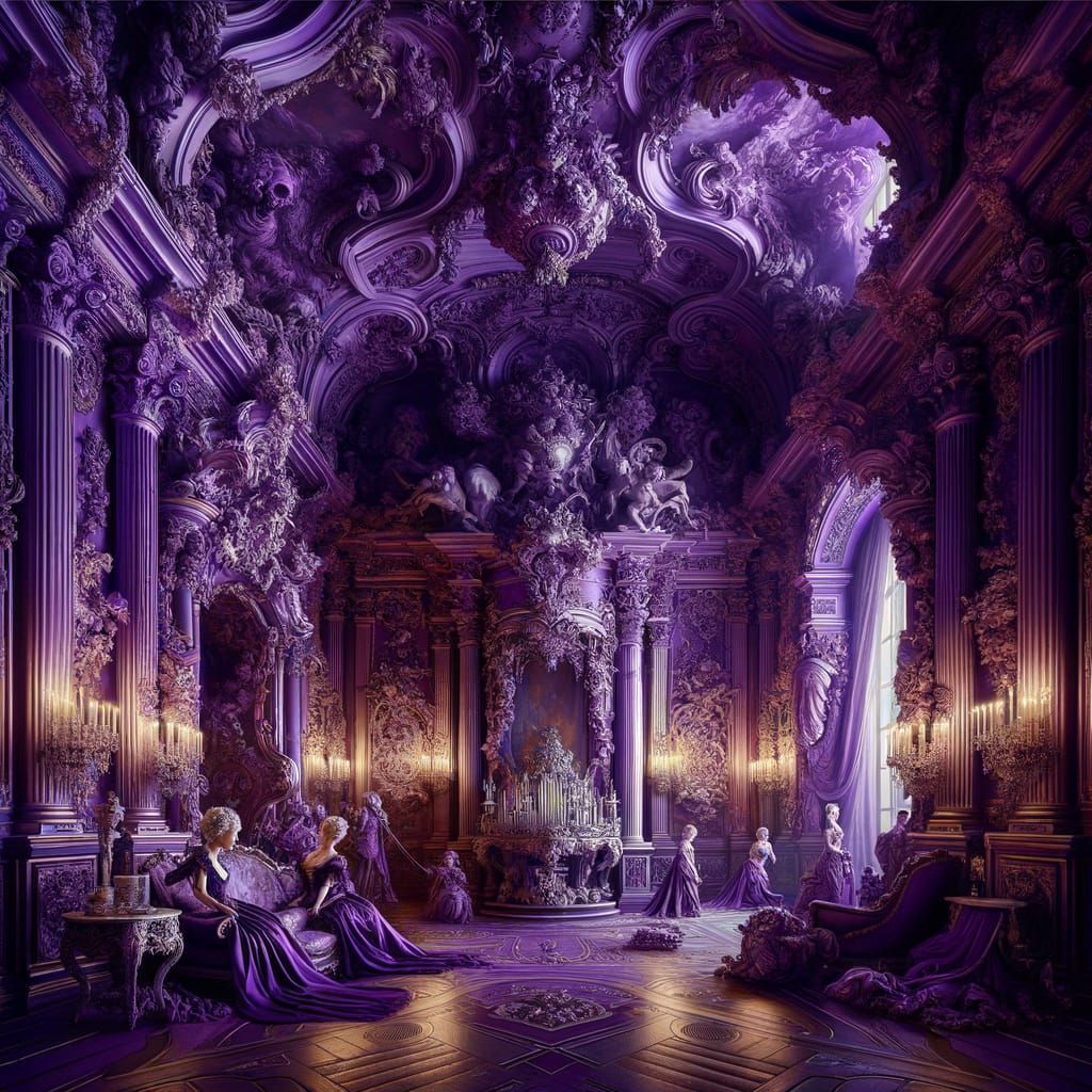 This image showcases a luxurious Baroque interior, rich in purple hues and ornate details. Dramatic lighting and shadows enhance the grandeur, with elaborate costumes and decorative elements characteristic of the era.
