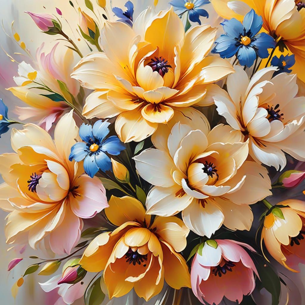 A close-up image of vibrant, beautiful flowers in a bouquet. The macro shot shows petals unfolding with soft, blurred edges, illuminated by warm, golden light. The style is reminiscent of abstract expressionism.