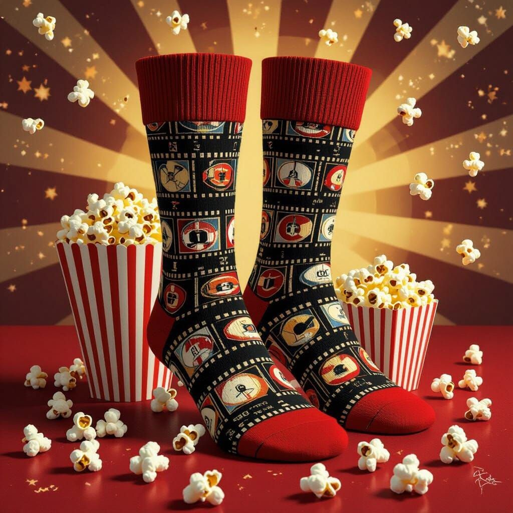 This image shows socks with vintage Hollywood film reels and popcorn. The design features texture, detail, and modern whimsy, in a photorealistic style reminiscent of digital art.