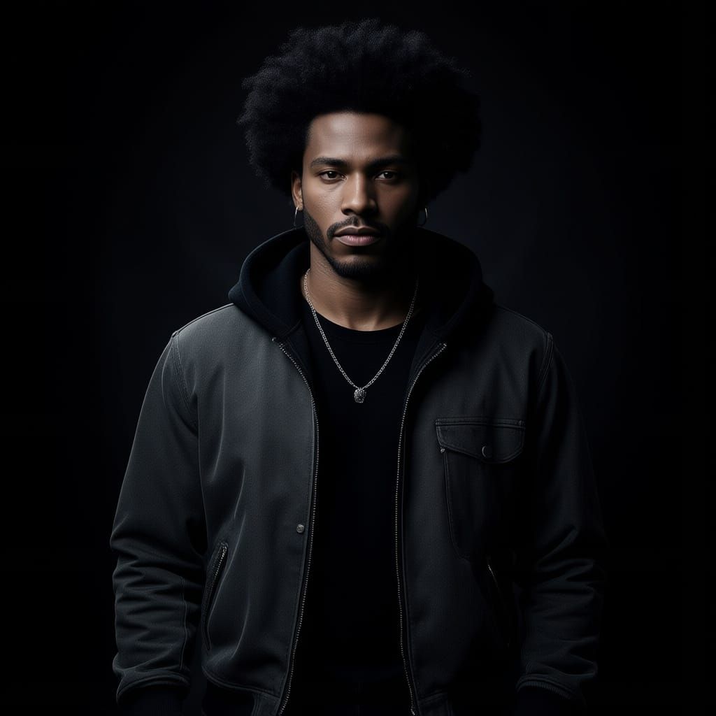 A striking black humanoid sheep with an athletic build, depicted in a hyperrealistic chiaroscuro style. Dramatic lighting creates intense shadows and highlights, reminiscent of old master paintings.