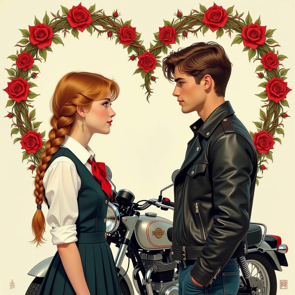 This image shows a wistful girl in a school uniform looking at a young man by a motorbike. A heart-shaped background of roses and thorns completes the scene in an art nouveau style.