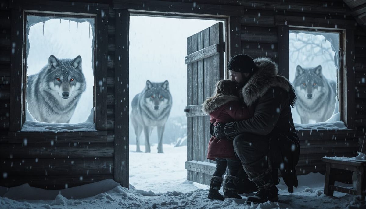 A cinematic film still shows a protective hunter holding his daughter in a cabin as wolves with glowing eyes peer through the walls during a blizzard. Shot with film grain and dramatic lighting.