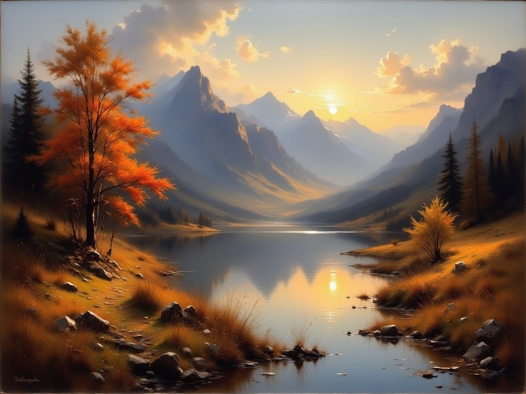 A realistic oil painting depicting a mountain landscape with a lake during autumn. Features bright golden light and vibrant orange, yellow, red, and blue hues, reminiscent of the old masters.