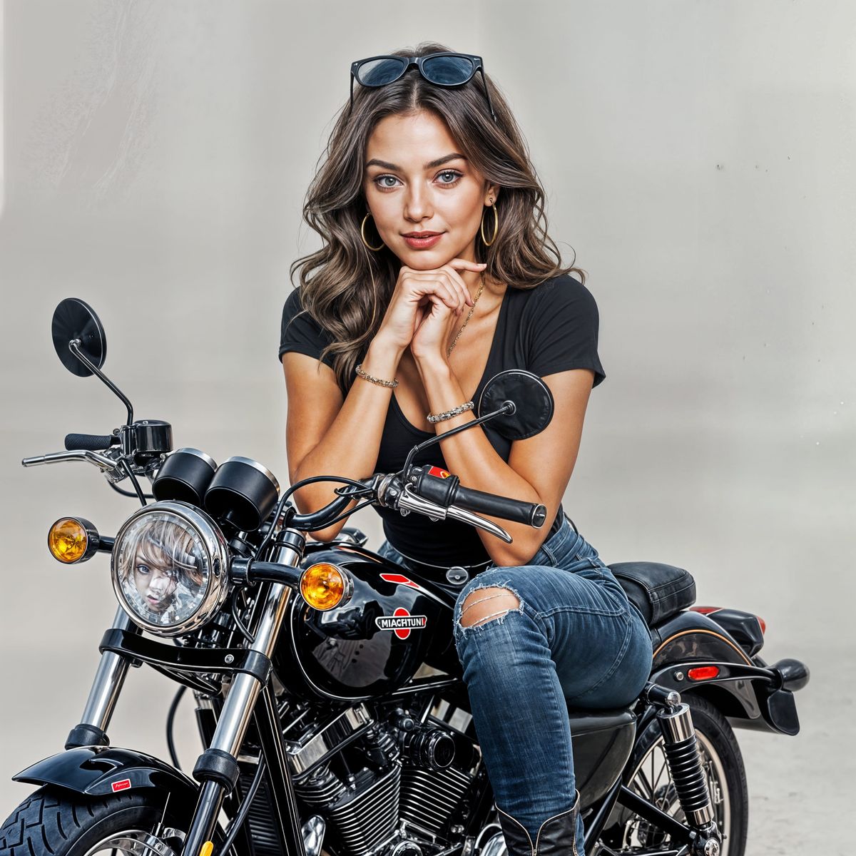 This image features a stunningly beautiful brunette woman in elegant attire, posing confidently on a black motorcycle with a vintage cityscape backdrop. She wears sunglasses and jewelry, exuding a captivating charm.