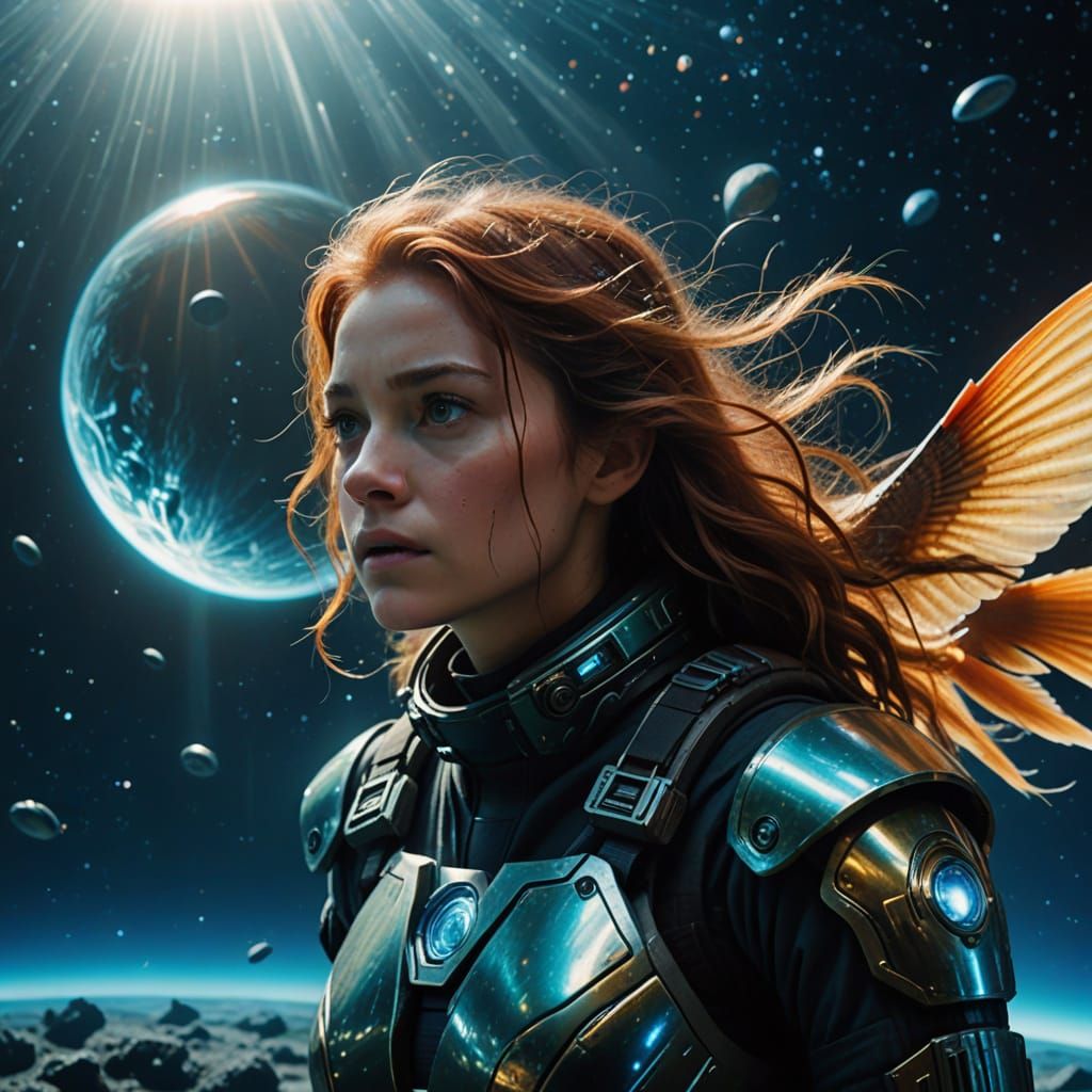 A stunning cinematic film still of a three-winged fish in space near Neptune, with vibrant post-impressionist colors and dynamic lighting, set against the soft glow of the planet's rings.