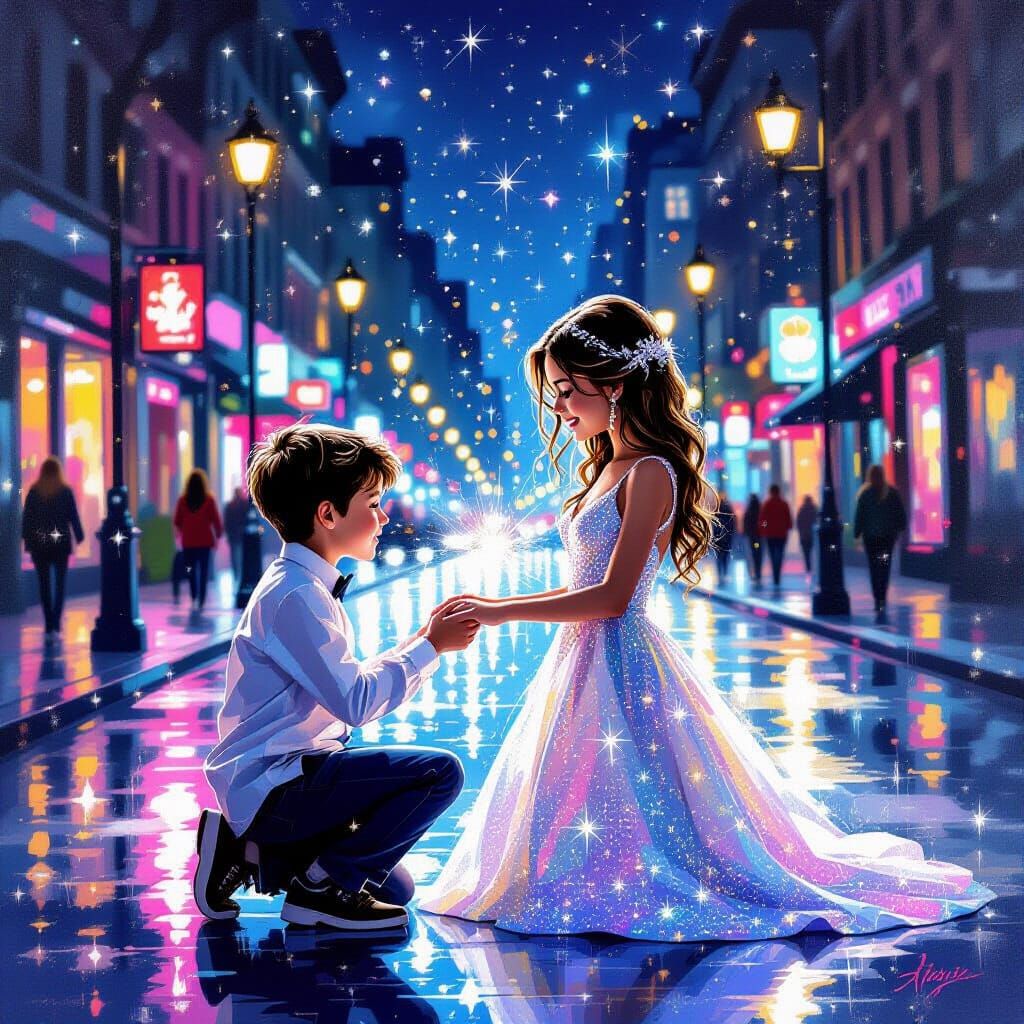 This image captures a proposal scene on a lively city street at night, featuring a couple in a dazzling diamond dress. Rendered in a dynamic graffiti art style with acrylic and oil gouache techniques, it boasts high contrast and vibrant colors.