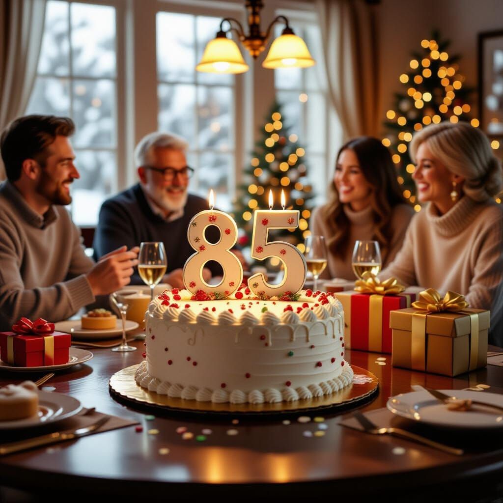 This realistic digital matte painting captures an 85th birthday party. Warm lighting illuminates a coffee table set with gifts, as guests celebrate around a table with happy expressions.