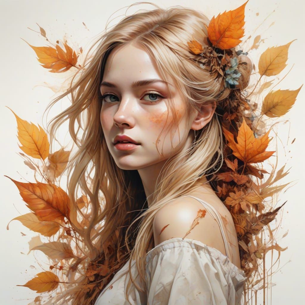 This image showcases a beautiful autumn woman with flowing hair, rendered in an expressive watercolor style with abstract shapes and intricate leaf motifs. Dramatic lighting highlights the warm, autumnal color palette.