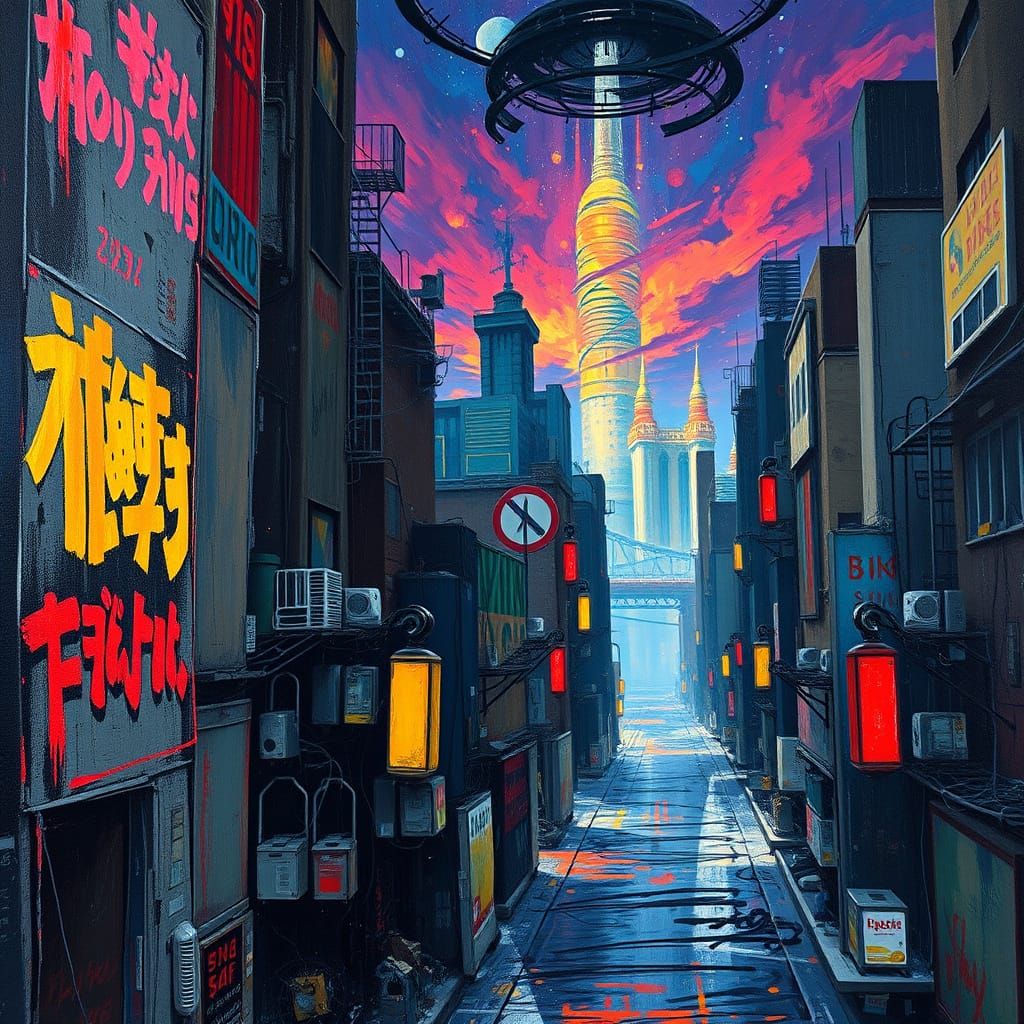 This image depicts urban decay reimagined as a stunning, detailed matte painting with a Y2K Futurism aesthetic. Rich, contrasting colors and textured brushwork create a dramatic, awe-inspiring scene.