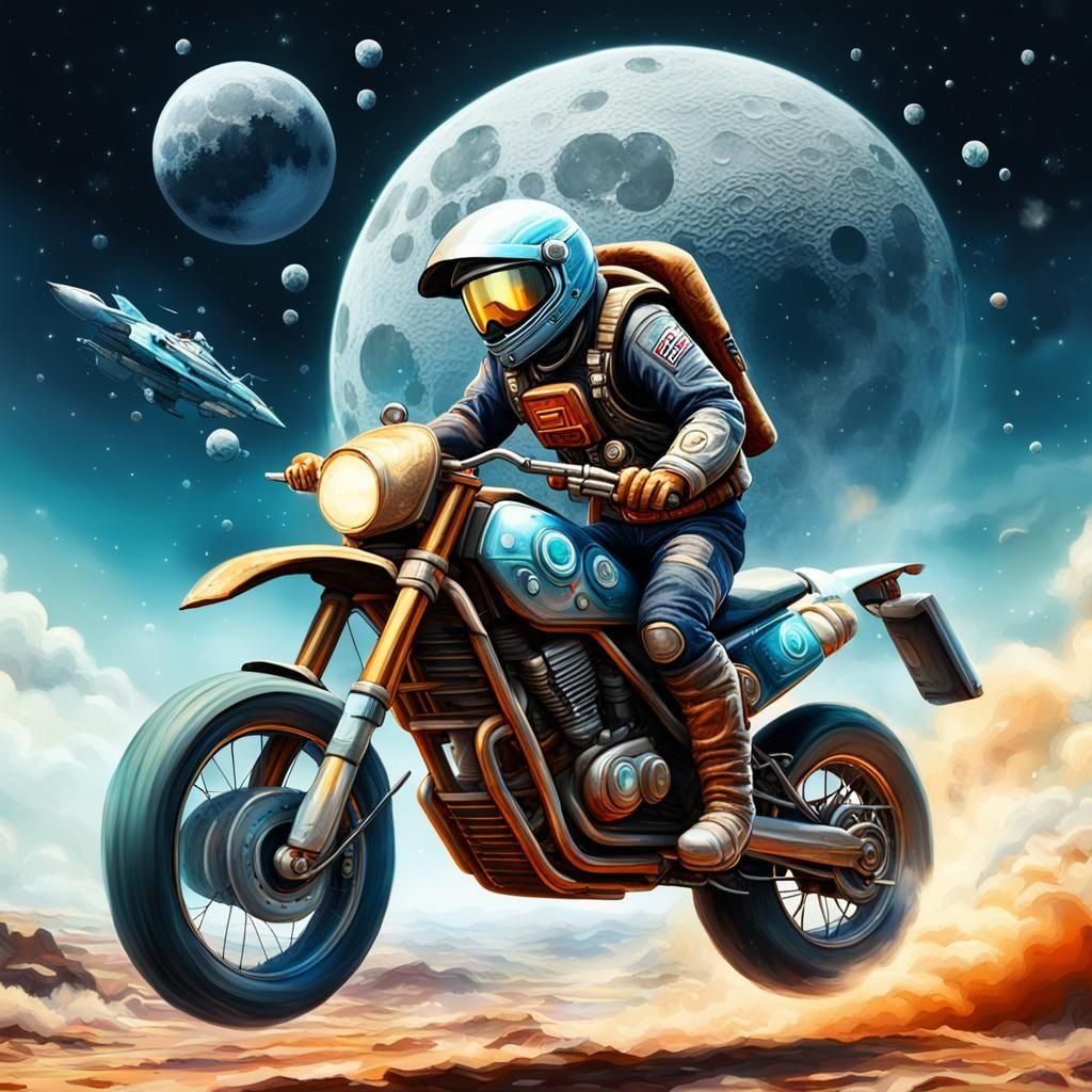 "Skyborne motorcycle and helmeted rider are blasting off, in transit to the moon. Intricate details. Concept art. action painting , vorticism, tilt-shift , fantasy , mixed media , surrealism"